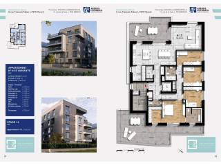 En façade principale se trouvent l'entrée pour piétons et l'accès au garage commun. La rési¬dence comporte un sous-sol, un rez-de-chaus¬sée et quatre étages. Au sous-sol nous retrou¬vons les emplacements privatifs, les caves, les locaux communs et autres locaux techniques. Les étages et le rez-de-chaussée sont réservés à l‘habitation ou toute destination admise par les règlements administratifs afférents.