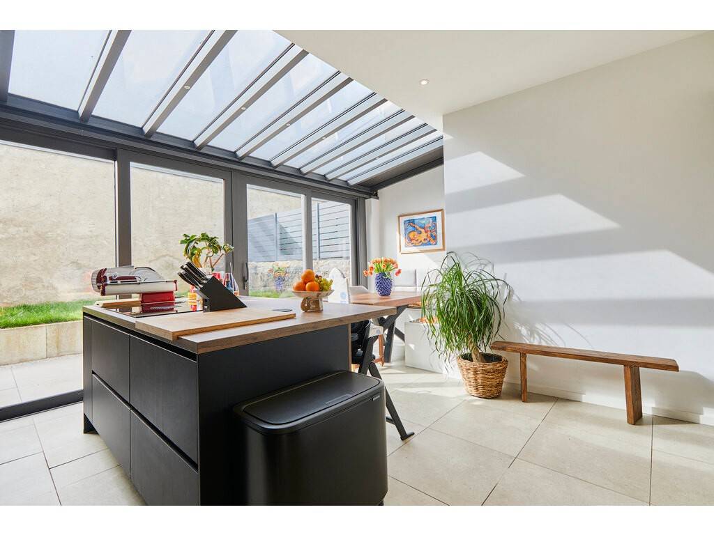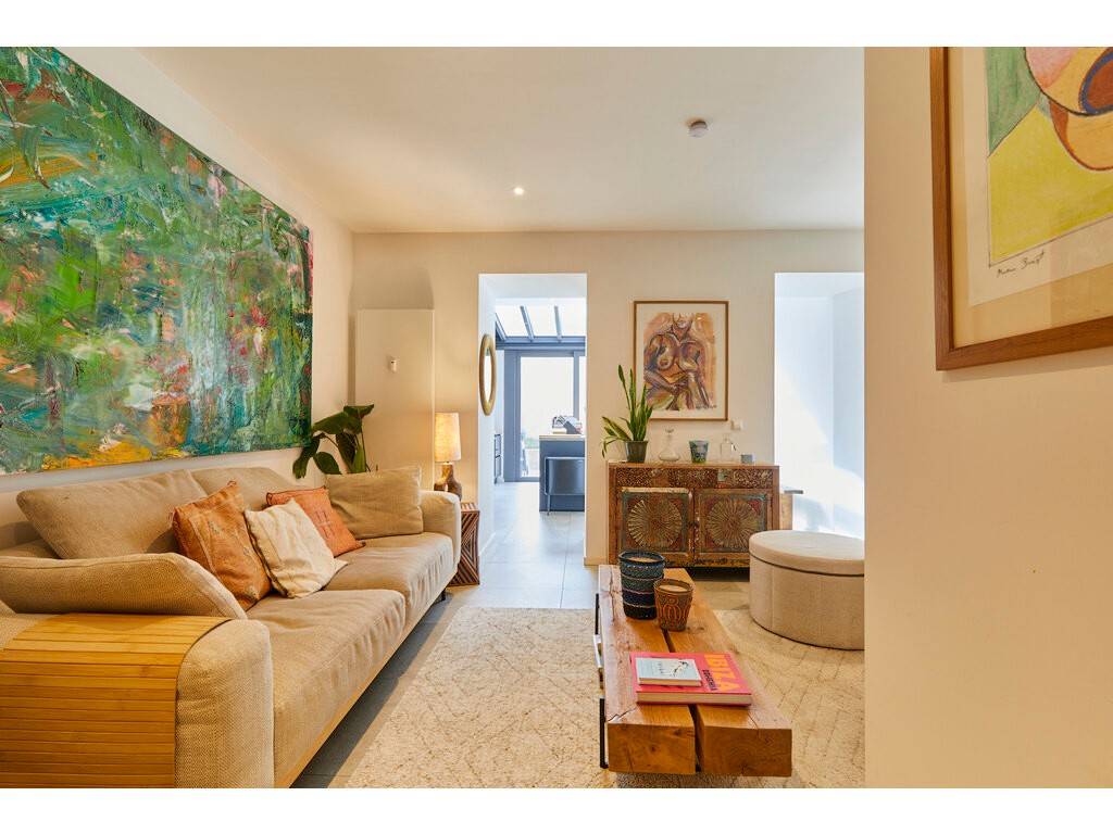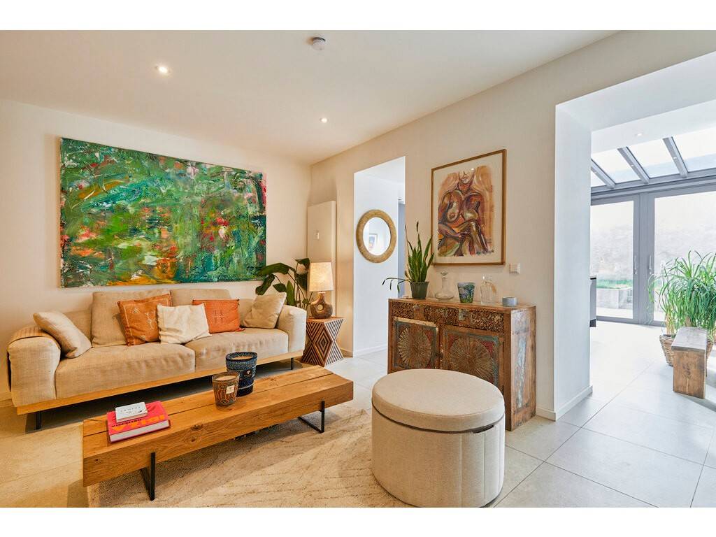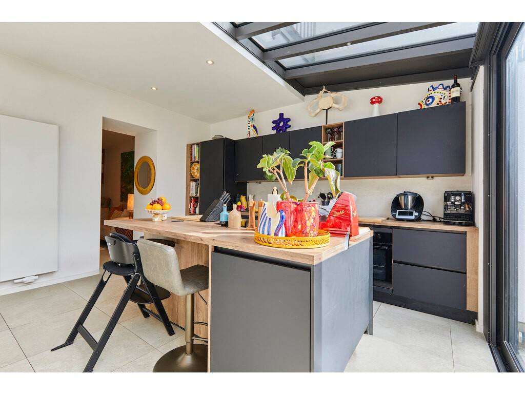 Le niveau inférieur se compose d'une grande cuisine ouverte sur une véranda avec accès direct au jardin, offrant un espace convivial et lumineux. Ce niveau comprend également un living confortable, des toilettes séparées ainsi qu'un grand débarras.
