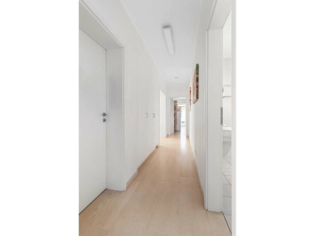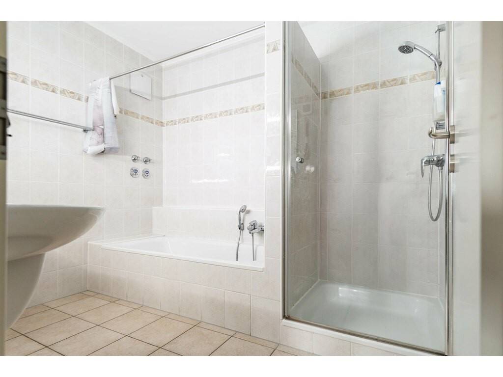 La salle de bain d’environ ±7m² est équipée d’une baignoire, d’une douche séparée ainsi que de deux lavabos, offrant un confort optimal pour la vie quotidienne. Un WC séparé et un débarras de ±2m² complète l’agencement fonctionnel de l’appartement.