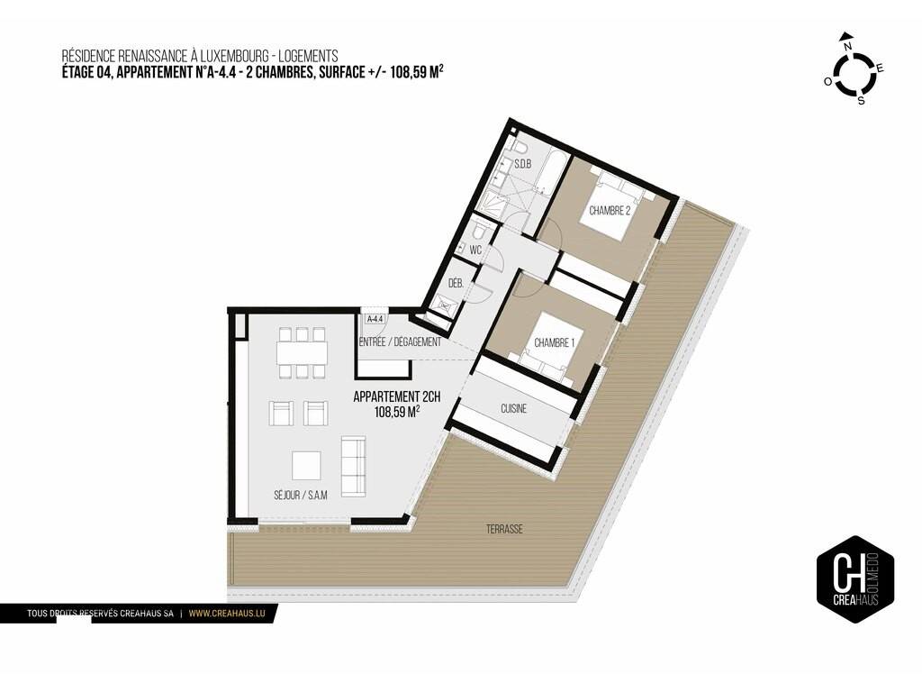 Creahaus a le privilège de vous présenter ce somptueux penthouse neuf de haut standing, d’une surface d’environ 109 m², situé au 4ème et dernier étage en retrait de la prestigieuse résidence Renaissance, sur la route d’Arlon dans le quartier recherché de Belair.