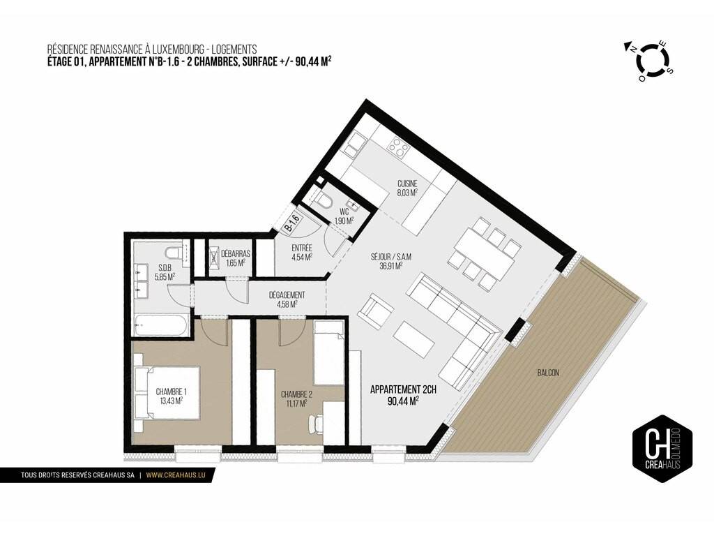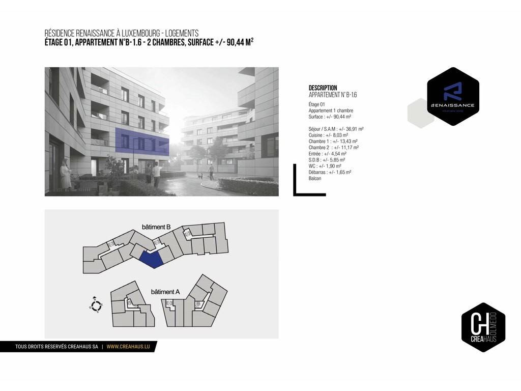 Creahaus a le privilège de vous présenter ce somptueux appartement neuf de haut standing, d’une surface d’environ 90 m² habitables, situé au 1er étage de la résidence Renaissance, à la Route d’Arlon dans le quartier recherché de Belair.