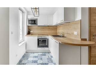 Prestations haut de gamme: tomettes en pierre naturelle, mobilier style industriel, plancher en bois massif, lave-linge, lave-vaisselle, four, micro-onde.
