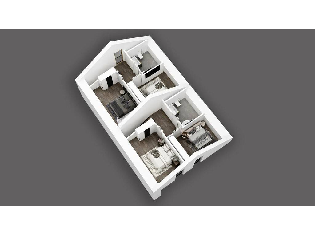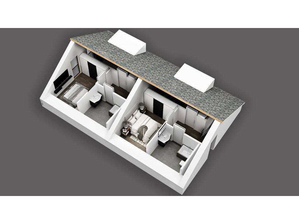 Au dernier étage, un hall de nuit, deux chambres à coucher et une salle de bains complètent harmonieusement ce projet.