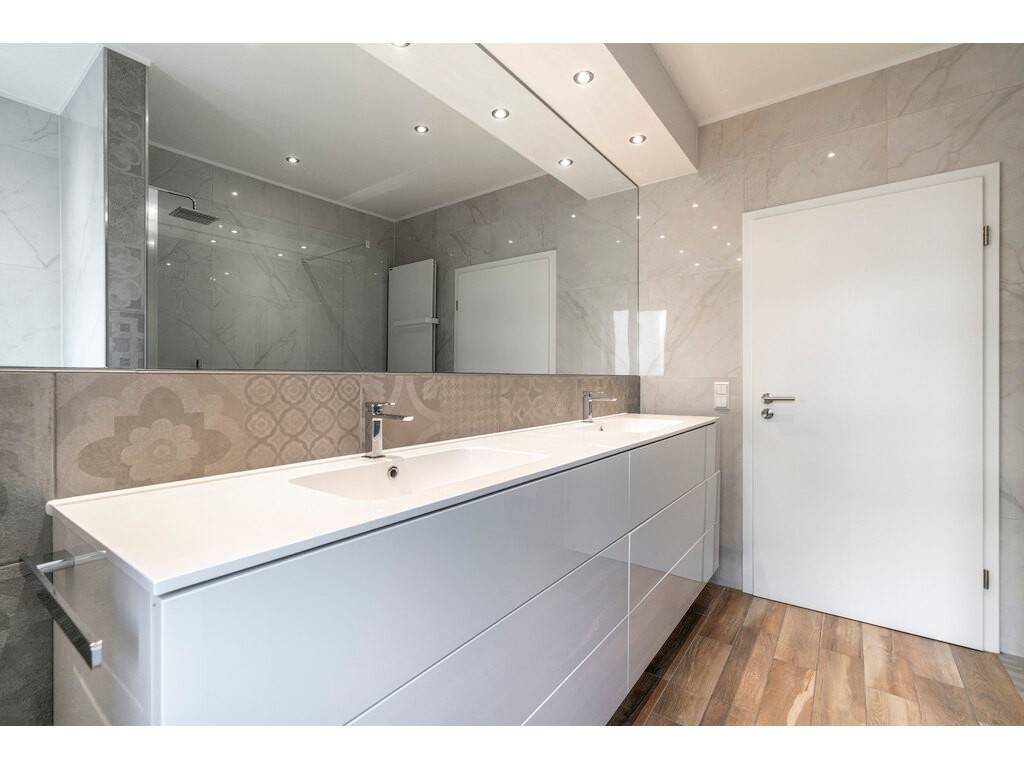 - Salle de bain contemporaine avec douche à l'italienne, double vasque, espace intégré pour machine à laver et accès à un balcon côté cour