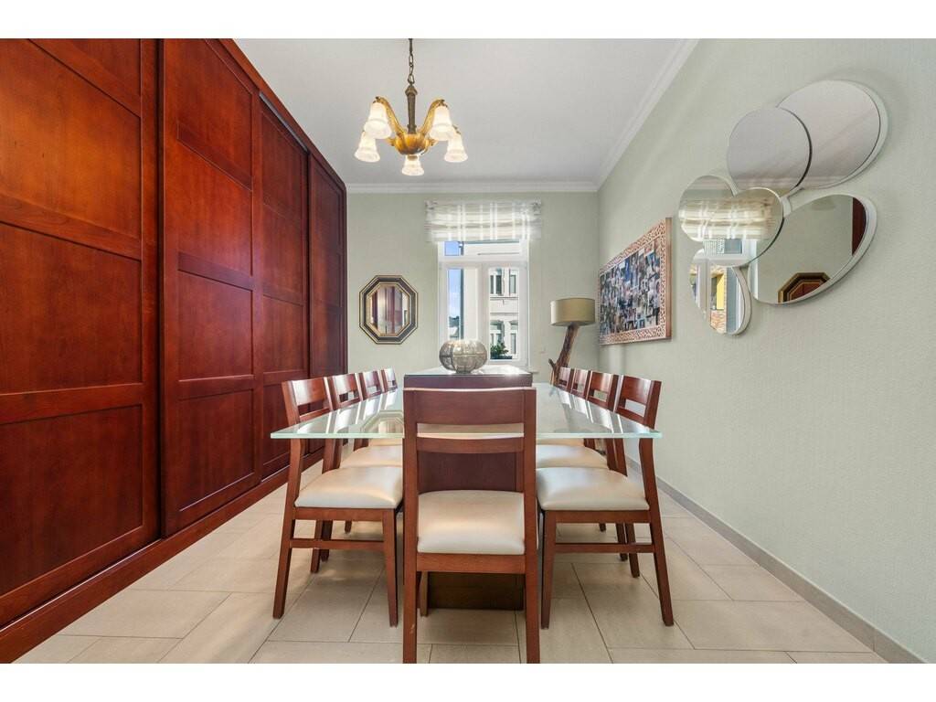 La maison dispose également d’une salle à manger d’environ ±17 m², parfaitement connectée à une cuisine moderne d’environ ±17 m². Celle-ci est entièrement équipée avec des appareils électroménagers haut de gamme des marques Miele et AEG, complétés par un îlot central et une hotte professionnelle, créant un espace fonctionnel et élégant pour les amateurs de cuisine.