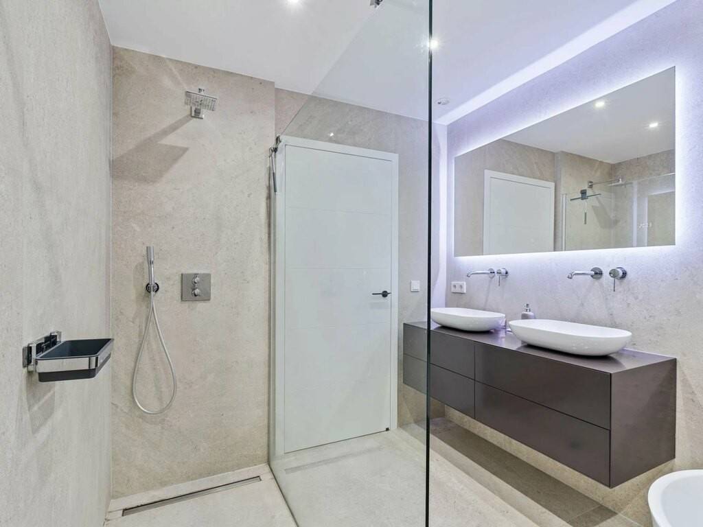 - Bathroom with double washbasin, walk-in shower, bathtub and WC