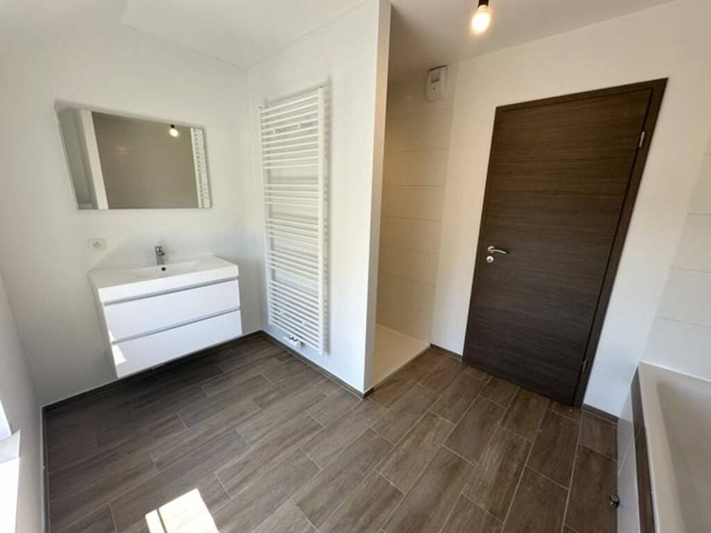 Hall de nuit 3 belles chambres (± 15 m², 13 m² et 12 m²) Salle de bains complète (douche 120x90, baignoire, meuble vasque, WC)