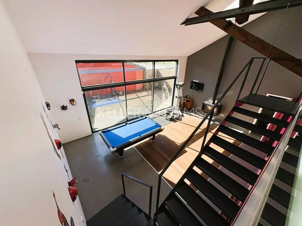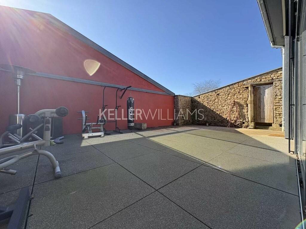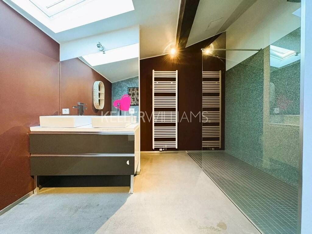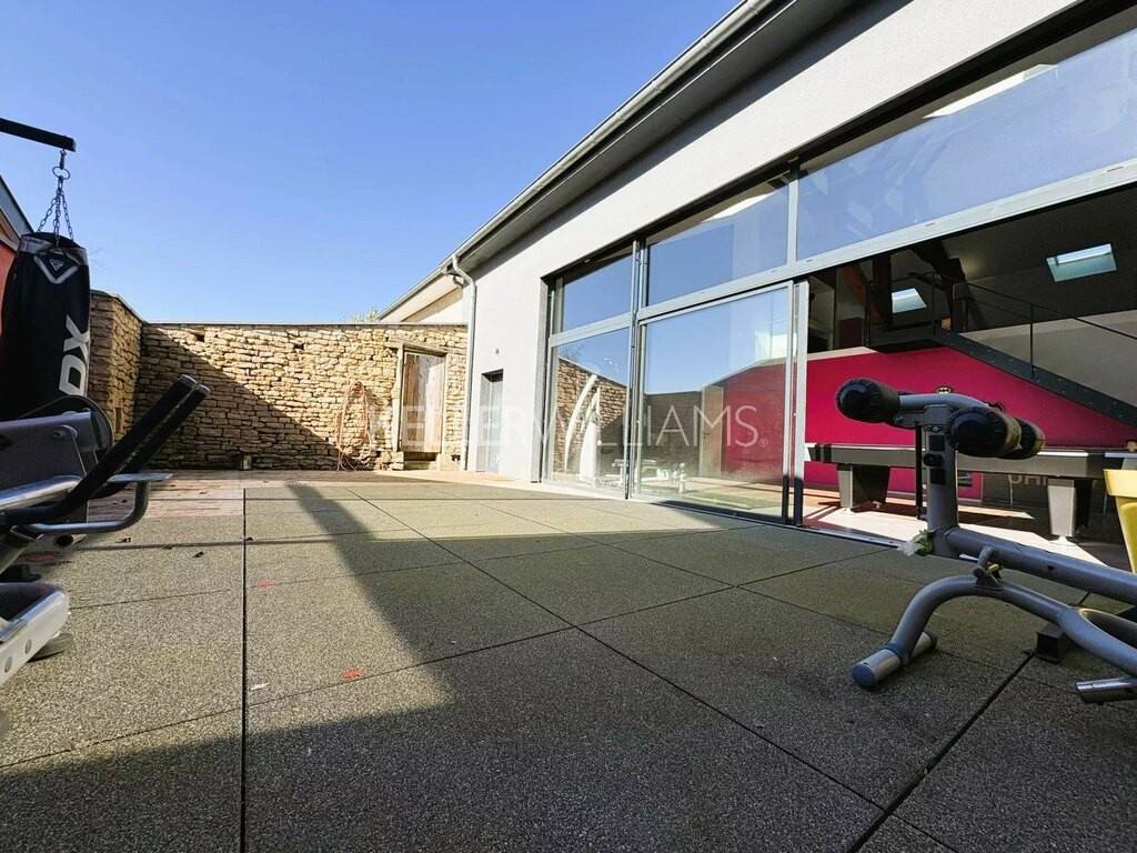 Un autre espace baigné de lumières avec un poêle à bois offre un volume de 50m² ouvert sur une terrasse de +- 50m² et donnant sur le jardin de 4 ares.