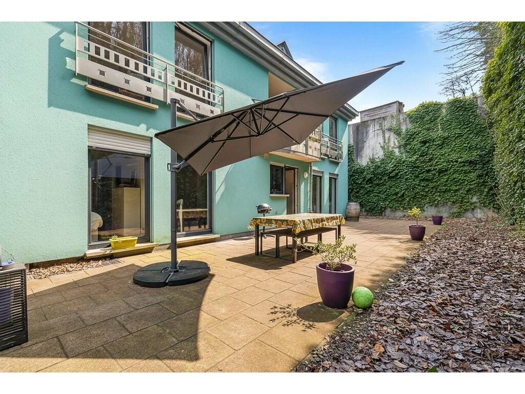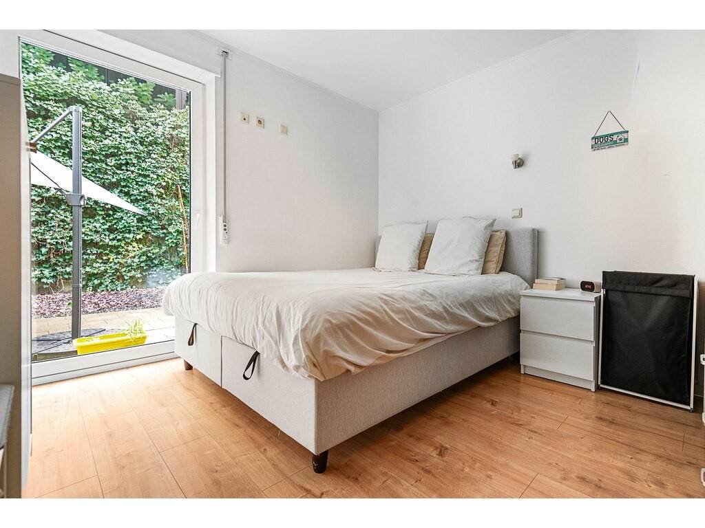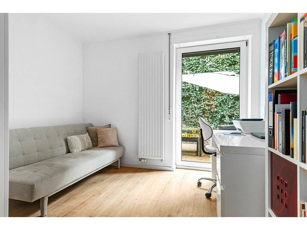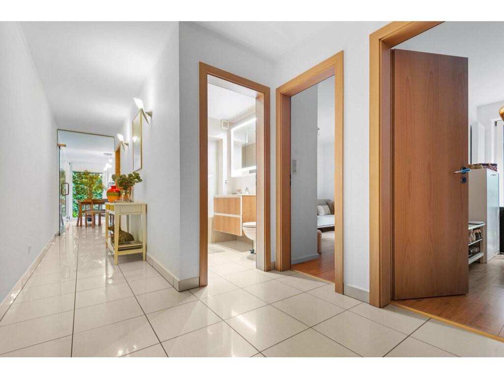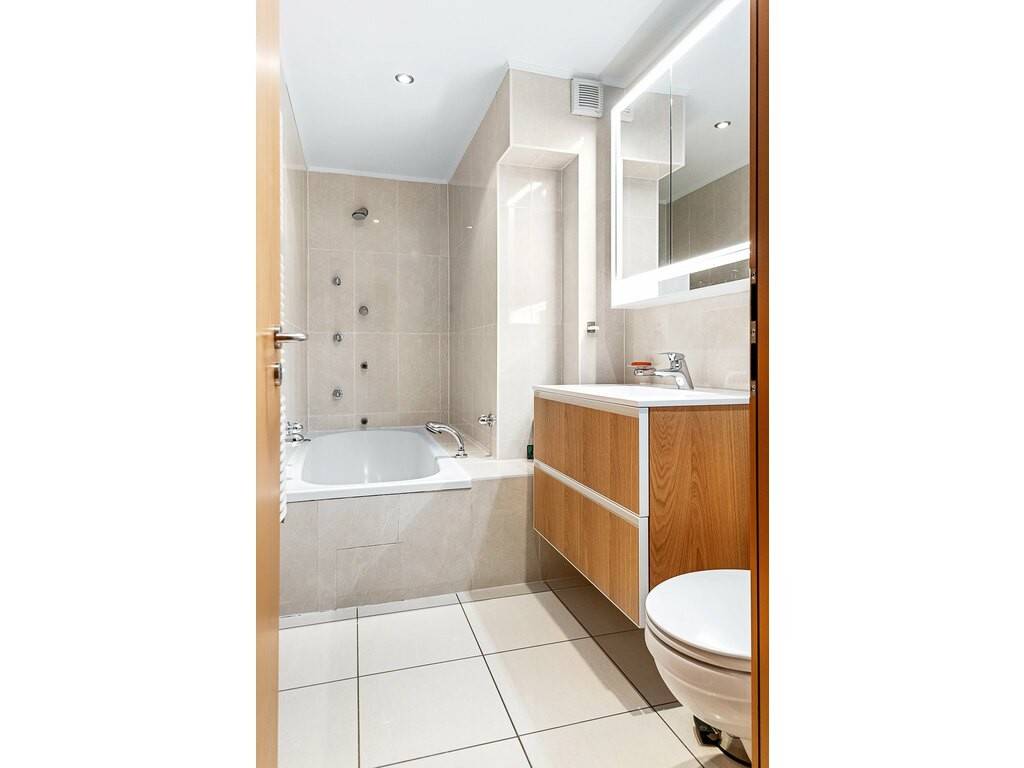 Au 1er étage, la porte d’entrée s’ouvre sur un hall doté d’un débarras actuellement aménagé en vestiaire, avec possibilité d’y créer un wc ou une buanderie grâce aux raccordements d’eau existants. Ce hall mène à l’espace nuit, composé d’une salle de bain rénovée de ± 6 m² et de deux chambres de ± 12 m² et 11 m², toutes deux offrant un accès direct à la vaste terrasse de ± 85 m² qui longe l’ensemble du logement et se prolonge vers la partie jardin.