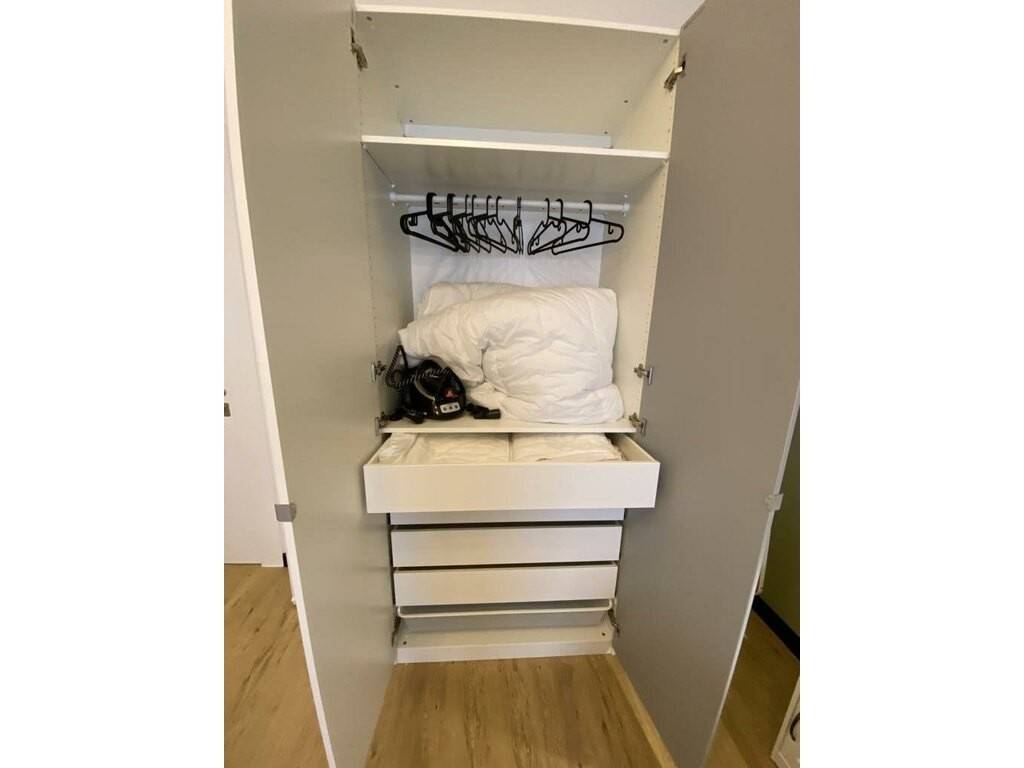 - le côté chambre est équipé d'une grande armoire à vêtements (1 couette, 2 oreillers, 2 parures complètes de draps de lit, taies d'oreillers et housses de couette) ;