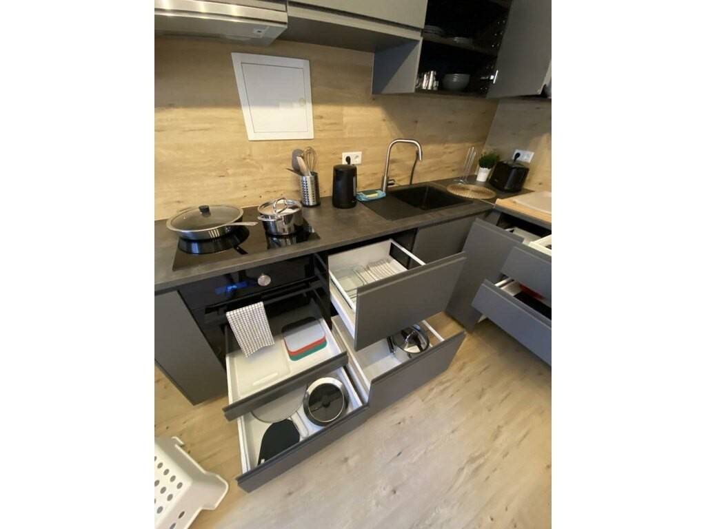 - une cuisine complètement équipée avec four/micro-ondes, hotte, lave-vaisselle, frigo américain avec congélateur, machine à café, bouilloire, toaster, casseroles, poêles, divers outils de cuisine et vaisselle complète pour 6 personnes, 1 table (avec rallonge), 4 chaises ;