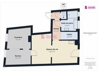 Il se compose d'une entrée, de WC séparés, d'une salle d'eau, d'un espace buanderie, d'une cuisine dinatoire, d'un séjour, d'un bureau (ou dressing) et d'une chambre.
