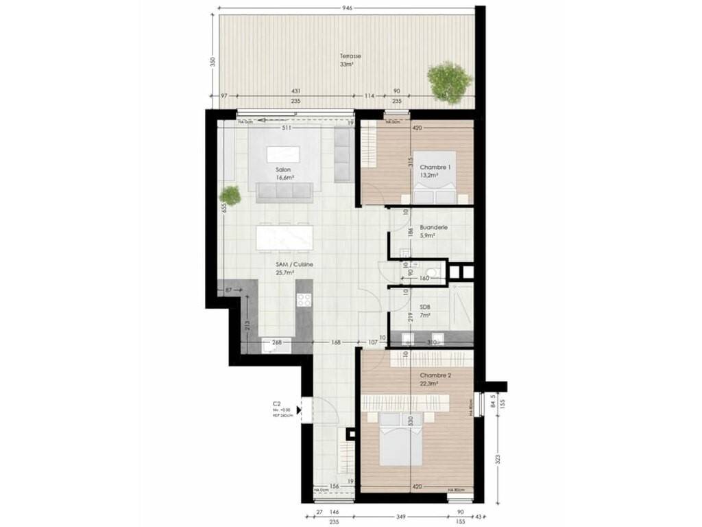 • 2 belles chambres • Une spacieuse terrasse de 33 m² • Un jardin privatif clôturé de 55 m² avec vue sur un parc