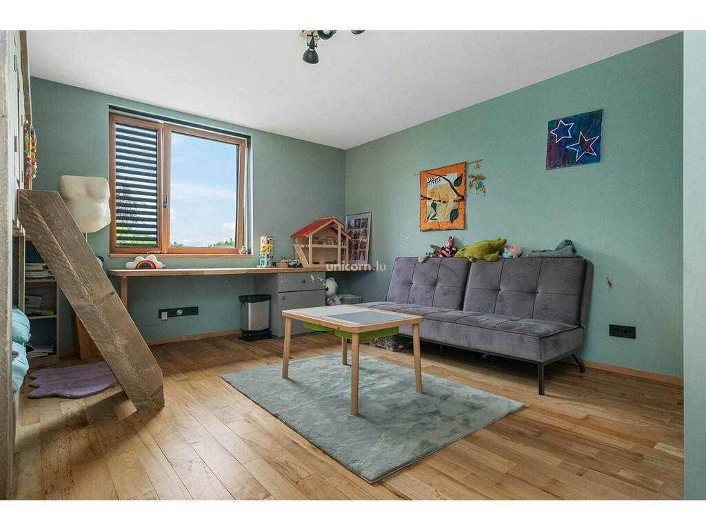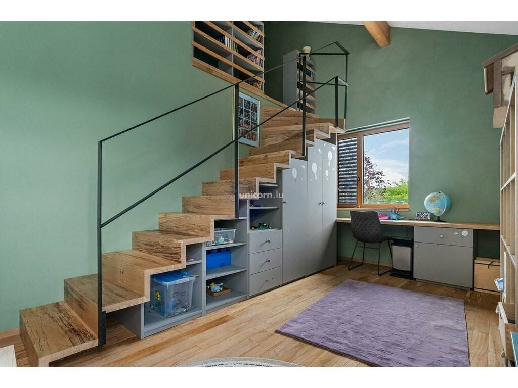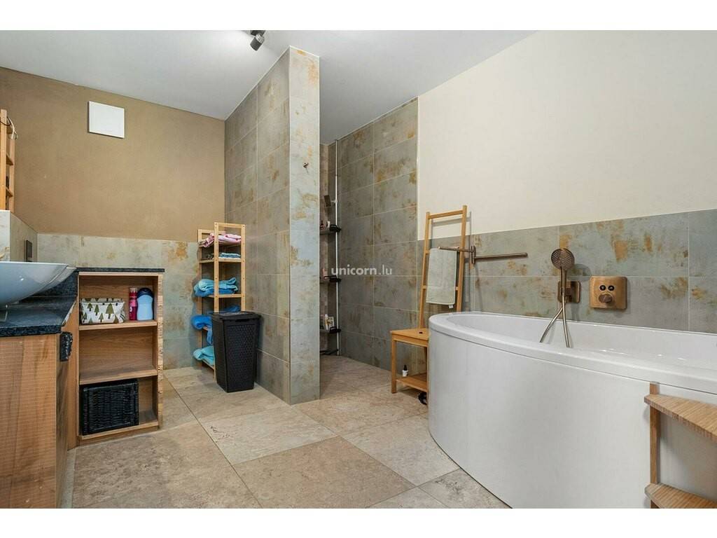 La maison s'étend sur deux niveaux. Le spacieux hall d'entrée s'ouvre sur l'espace de vie principal, comprenant un salon, une salle à manger et une cuisine ouverte. Cet espace est légèrement surélevé de deux marches, créant une belle dynamique d'espace. Depuis la salle à manger, vous accédez directement à une grande terrasse, idéale pour les repas en extérieur ou les moments de détente en famille. Vous trouverez au rez-de-chaussée également une buanderie, une chaufferie, ainsi qu'une toilette et un vestiaire.