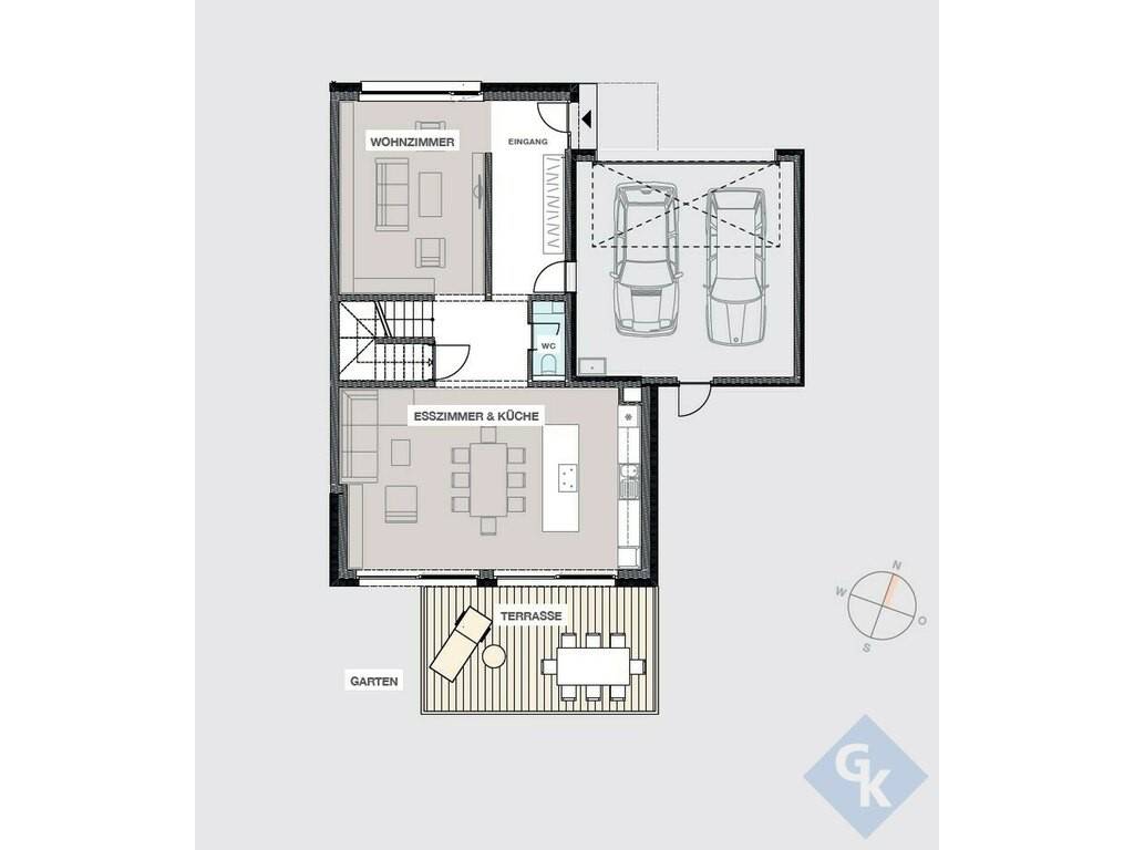 - Au rez-de-chaussée : hall d'entrée – living – cuisine ouverte sur salle à manger – WC séparé – garage pour deux voitures – terrasse et jardin – deux parkings extérieurs.