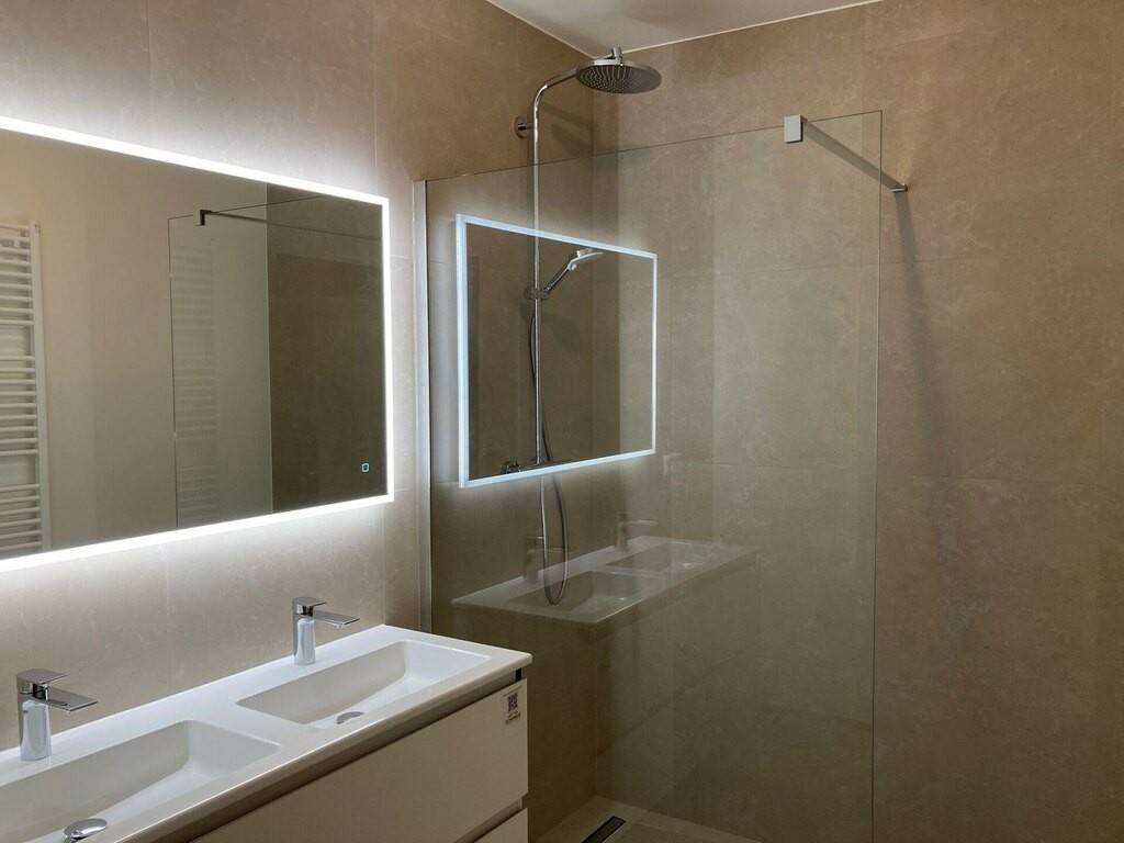 Bel appartement spacieux et lumineux (1ère location après restauration) comprenant : un hall d'entrée, un WC séparé, un séjour avec accès à la terrasse, une cuisine équipée avec accès à la terrasse, un hall de nuit, 2 chambres à coucher, une salle de douche avec 2 vasques, une buanderie commune, 1 parking intérieur et une cave.