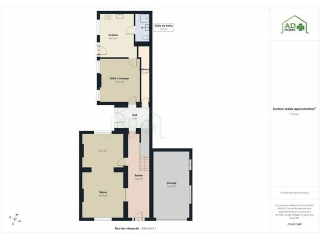 Au rez-de-chaussée, elle se compose d’un vaste hall d’entrée, d’un salon lumineux, d’une salle à manger ainsi que d’un second hall avec débarras menant à un espace dédié aux repas, une cuisine et une salle de douches.