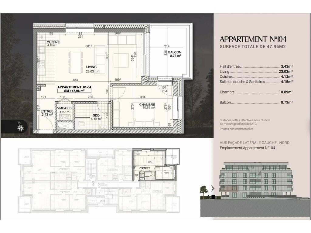 Auf der ersten Ebene gelegen, verfügt die Ein-Zimmer-Wohnung über eine Wohnfläche von 47,96 m2 und einen Balkon von 8,73 m2 .