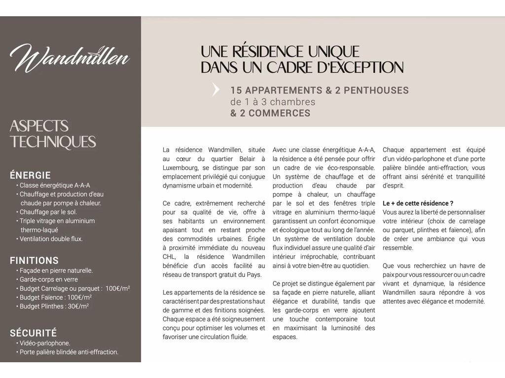 WANDMILLEN verfügt über ein AAA-Energiezertifikat und zeichnet sich durch eine moderne, gediegene und zeitlose Architektur aus. Es fügt sich perfekt in den bestehenden städtischen Kontext ein. Priorität für die Qualität der Ausstattung und der Verarbeitung .
