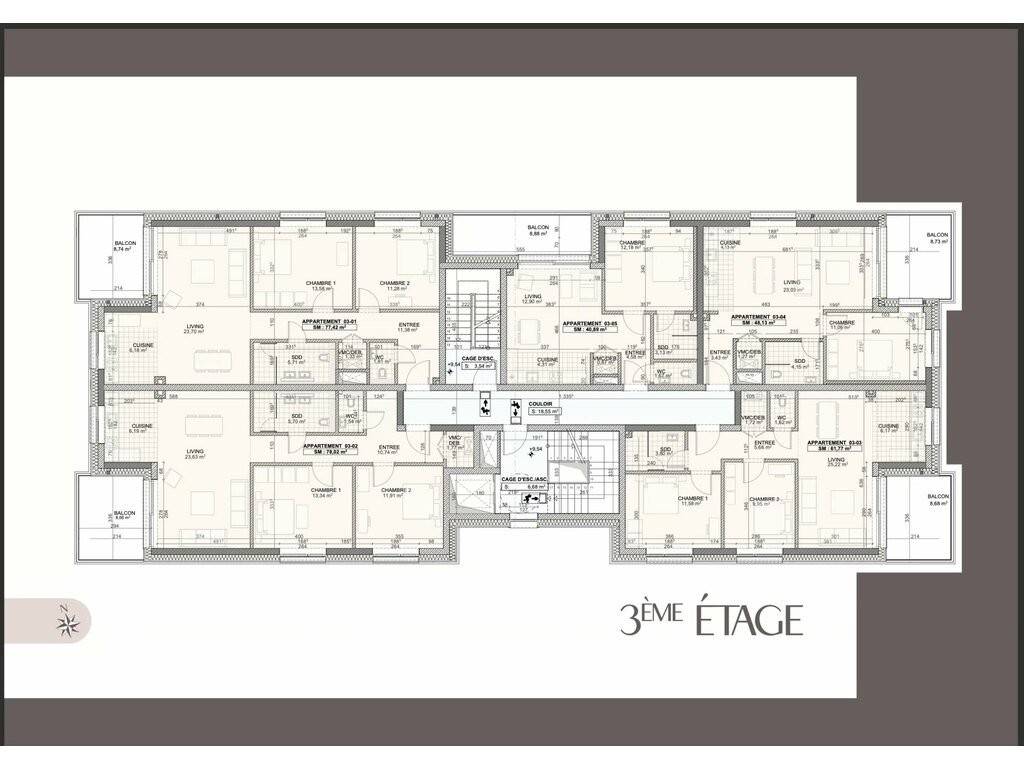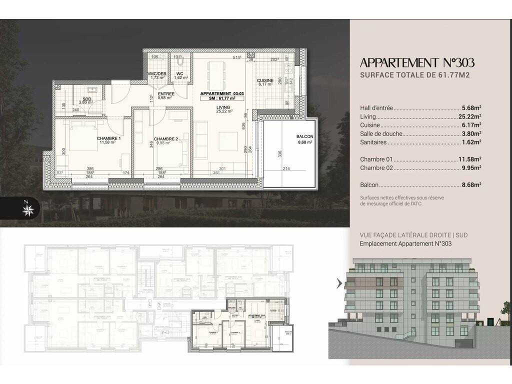 Die Wohnung mit zwei Schlafzimmern befindet sich im dritten Stock und verfügt über eine Wohnfläche von 61,77 m2 und einen Balkon von 8,68 m2 .