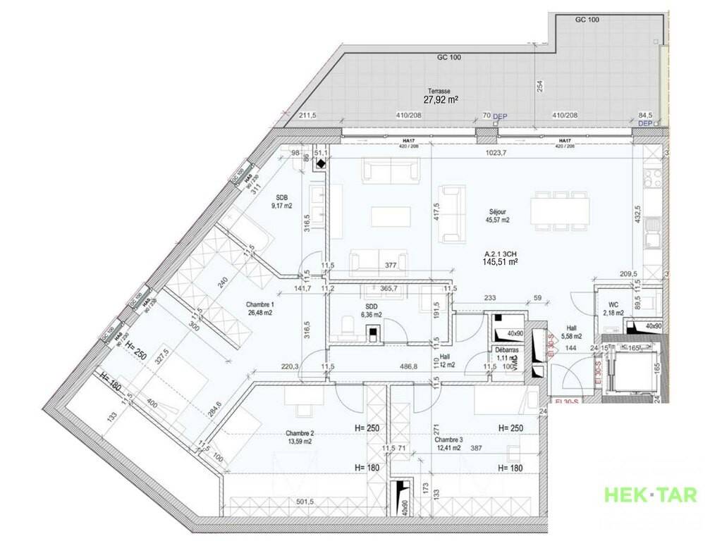 This 2nd-floor penthouse comprises a 5.58 m² entrance hall, a fitted kitchen opening onto a 45.57 m² living room with access to a 28 m² terrace, a storeroom and a separate toilet, a first bedroom of ± 26.48 m² with an ensuite bathroom of ± 9.17 m², a second bedroom of ± 13.59 m², a third bedroom of ± 12.41 m² and a shower room of ± 6.36 m².