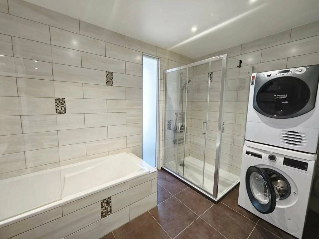 - Une salle de bain moderne avec douche et baignoire.