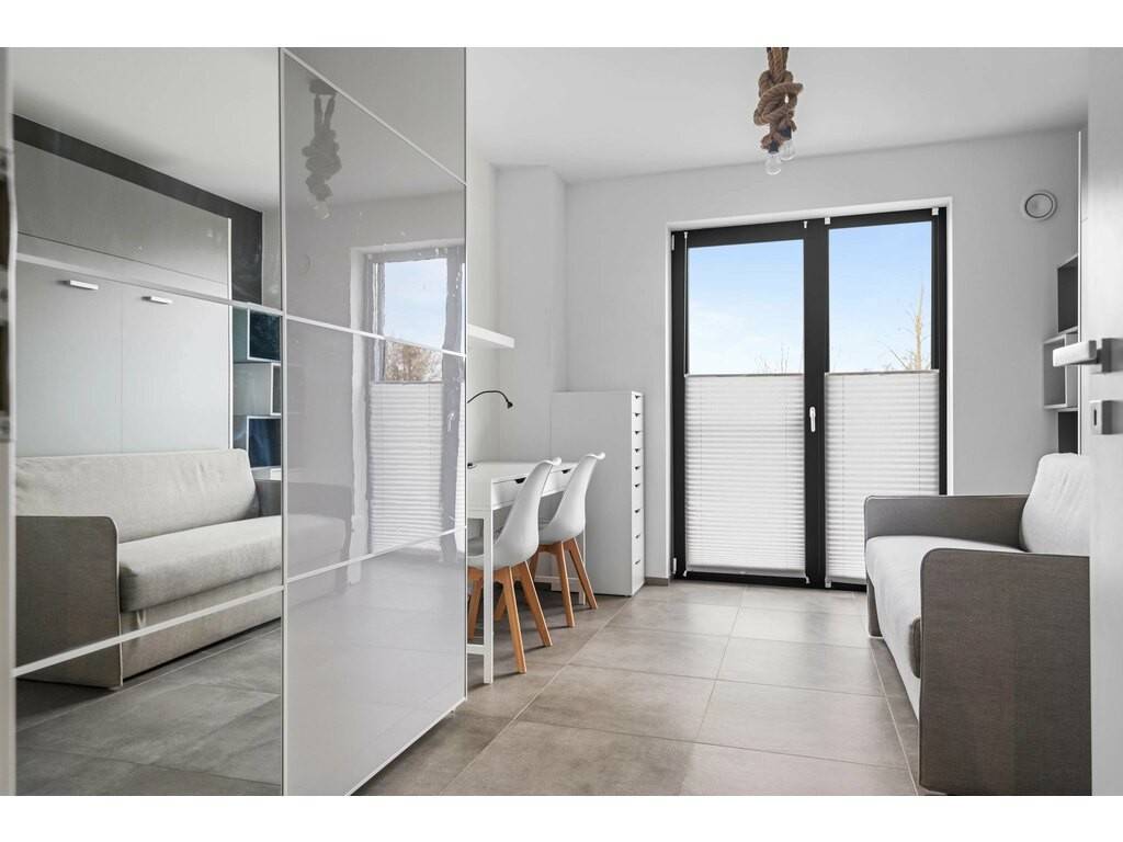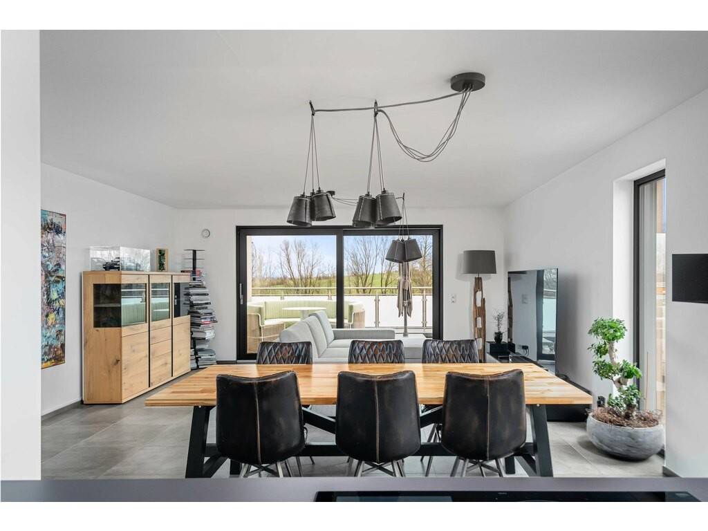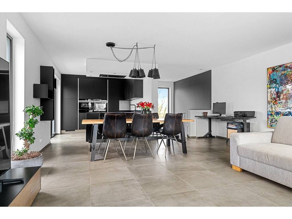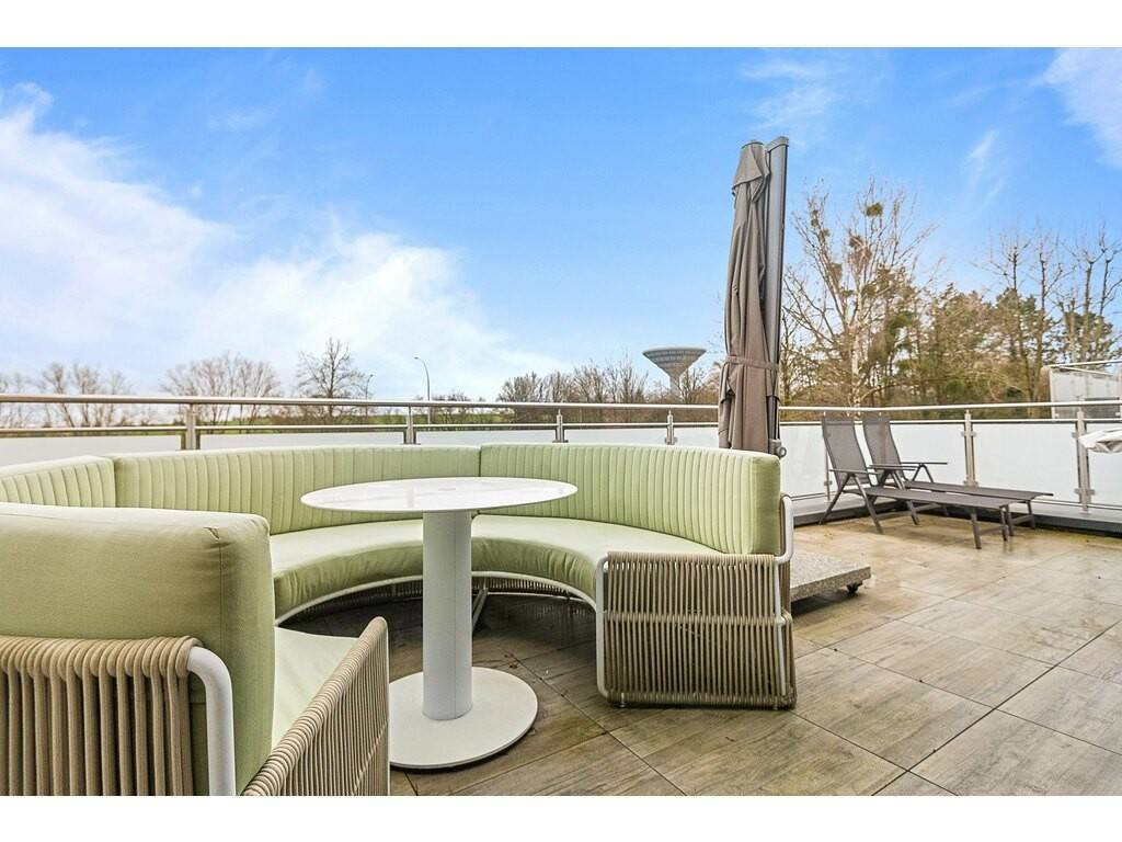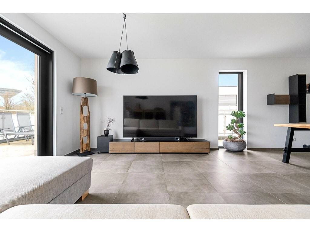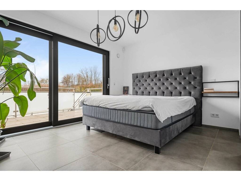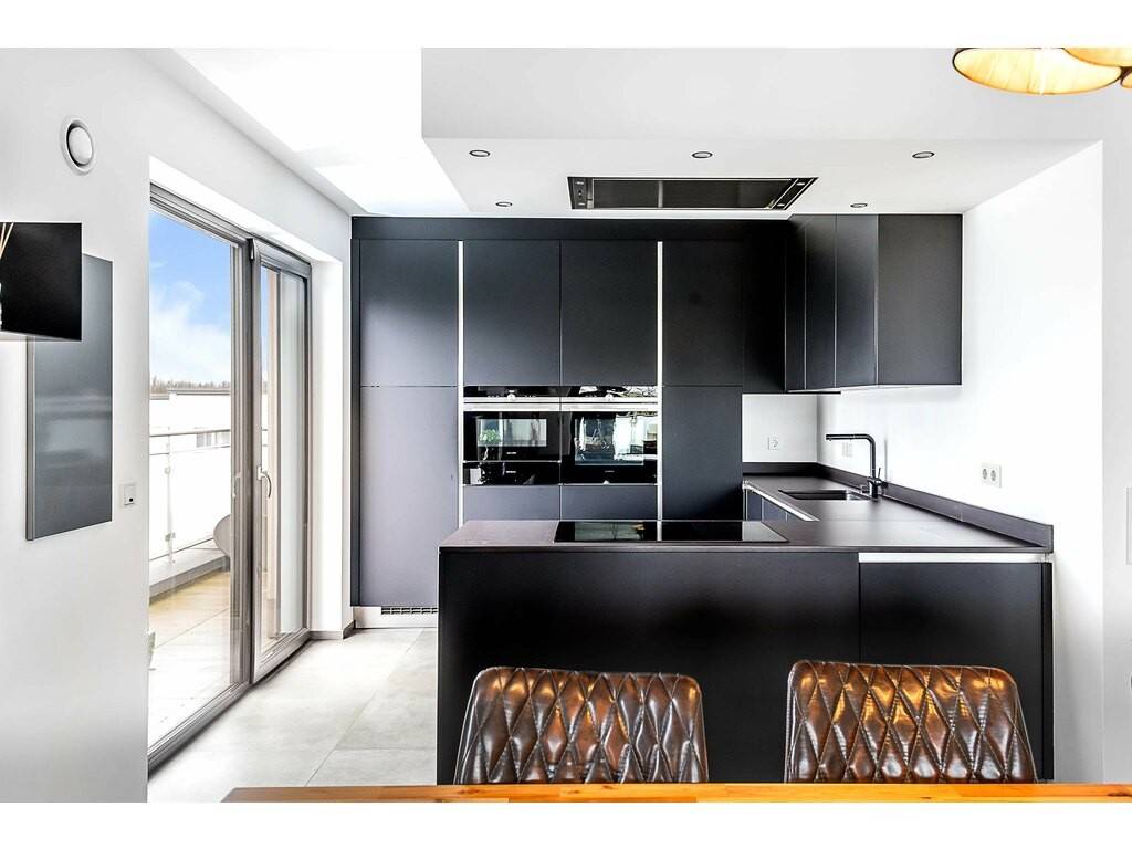 Im zweiten Stock befinden sich die Hauptwohnräume, darunter ein geräumiges, helles Wohnzimmer von ± 35 m², das auf eine Terrasse mit einem Balkon mit einer Gesamtfläche von ± 46 m² führt, die nach Ost-Süd-West ausgerichtet ist, sowie eine offene, moderne Küche von ± 12 m², wo die Fläche der Wohnung vervollständigt.
