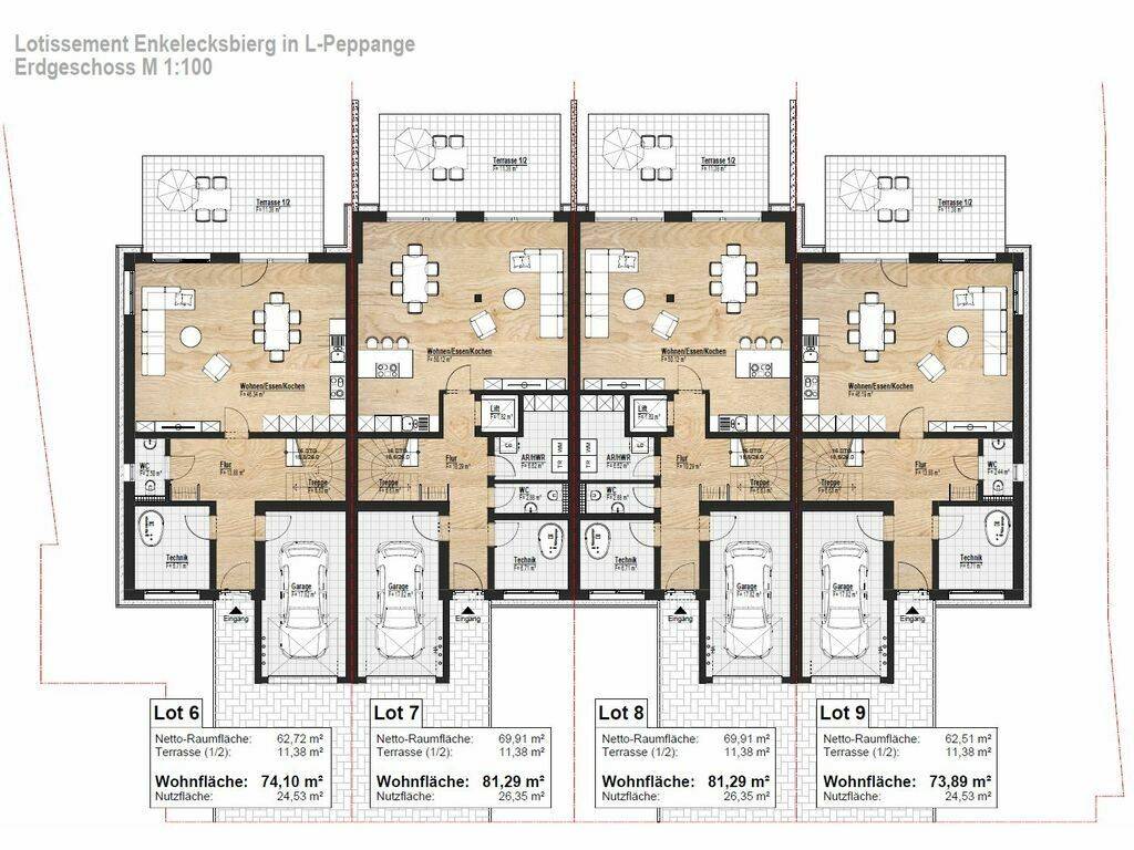 Die Wohnfläche beträgt von 221,67 m² und einer Nutzfläche von 25,9 m² und verteilt sich wie folgt: - Erdgeschoss: - Eingangsbereich - Technikraum - Gäste-WC - Offener Wohn-, Ess- und Küchenbereich - Aufzug in den Mittelhäuser Lot 7 / Lot 8 (Alternativer Grundriss Vergrößerung) - Garage