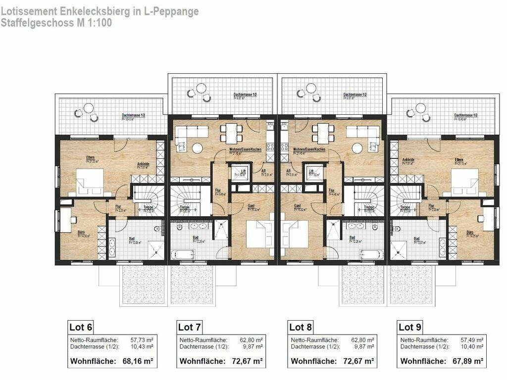 Staffelgeschoss: - 1 Büro - 1 Schlafzimmer mit Ankleide - Bad mit Wanne und Dusche - Dachterrasse