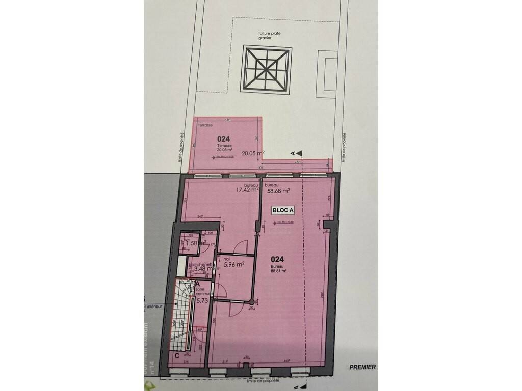 - 1er étage: hall et zone commune, divers espaces bureaux, WC séparé, kitchenette.