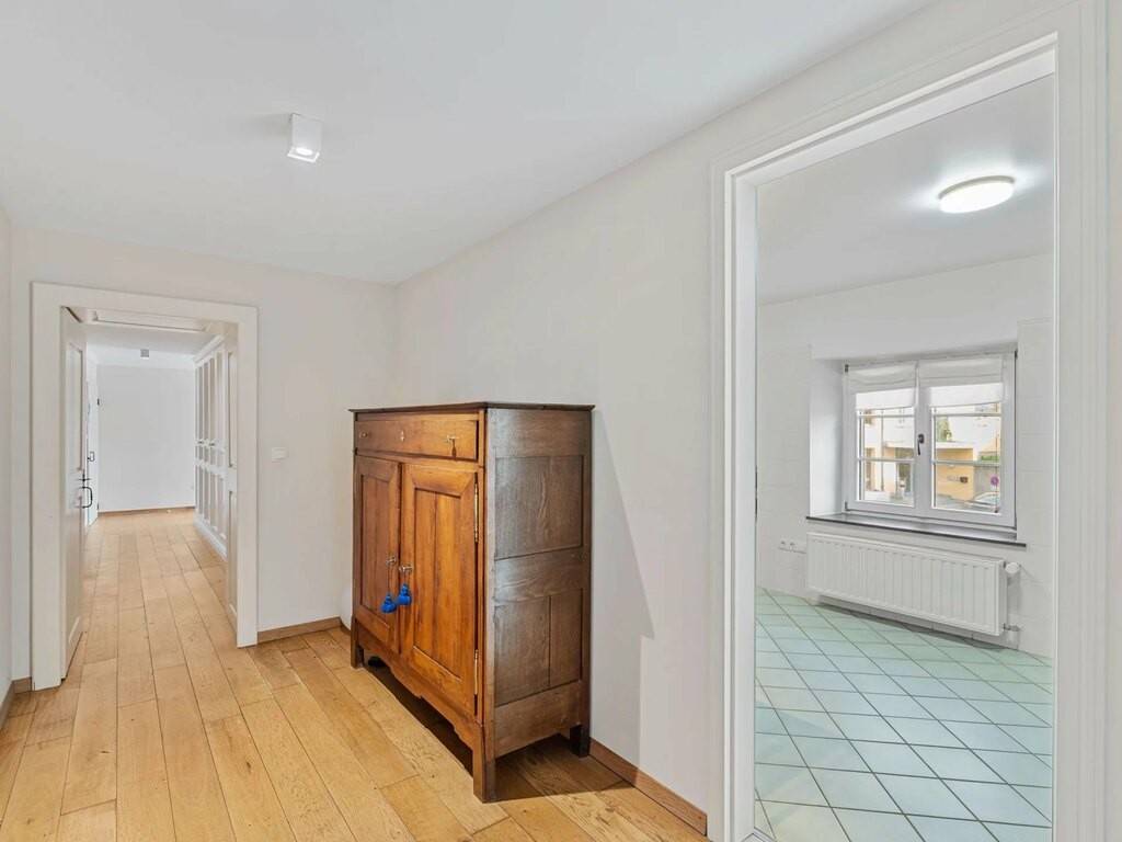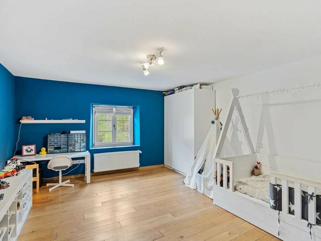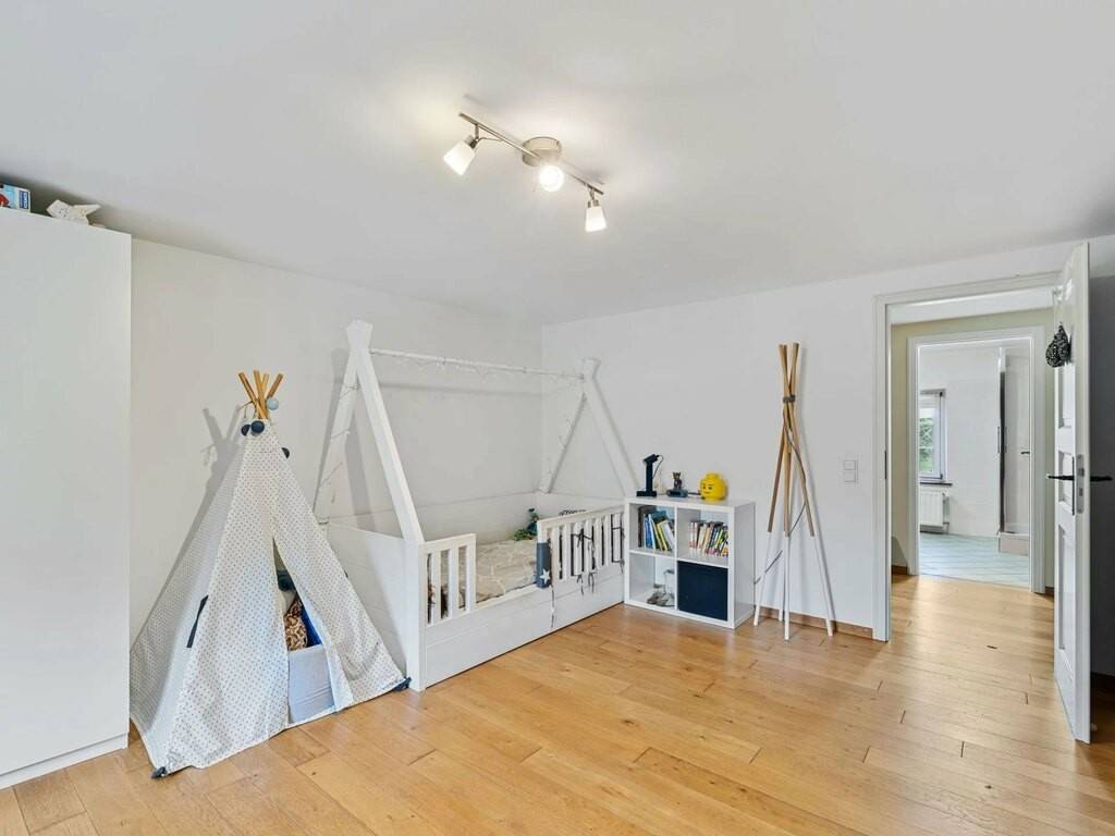 Im ersten Stock befinden sich 2 große Schlafzimmer (+-16 m², +-19,30 m²) und eine Master-Suite von +-19,17 m² mit eigenem Duschbad und begehbarem Kleiderschrank im Flur). Ein +-27,32 m² großer Freizeitbereich mit Zugang zum Garten vervollständigt diese Etage und bietet über eine Treppe Zugang zum Dachgeschoss.