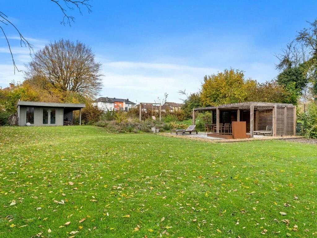 Im Erdgeschoss führt die Eingangshalle zu einem Wohnzimmer (+-16 m²), einem Esszimmer (+-17 m²) sowie zu einer geräumigen Küche von 37 m² mit Zugang zu einer großen Terrasse von 56 m² und einem großen Landschaftsgarten mit Pergola und Gartenhaus. Diese Ebene umfasst auch ein Gäste-WC, eine Garage für 2 Autos sowie eine Waschküche.