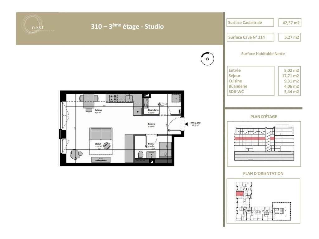 Das Studio Lot3.10.C.STU befindet sich im 3. Stock und hat eine Katasterfläche von ±42,57 m². Es setzt sich wie folgt zusammen: