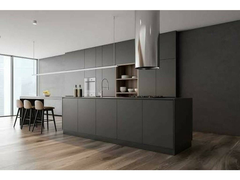 Salon double hauteur, cheminée contemporaine, cuisine ouverte équipée Miele avec îlot central et coin repas ;
