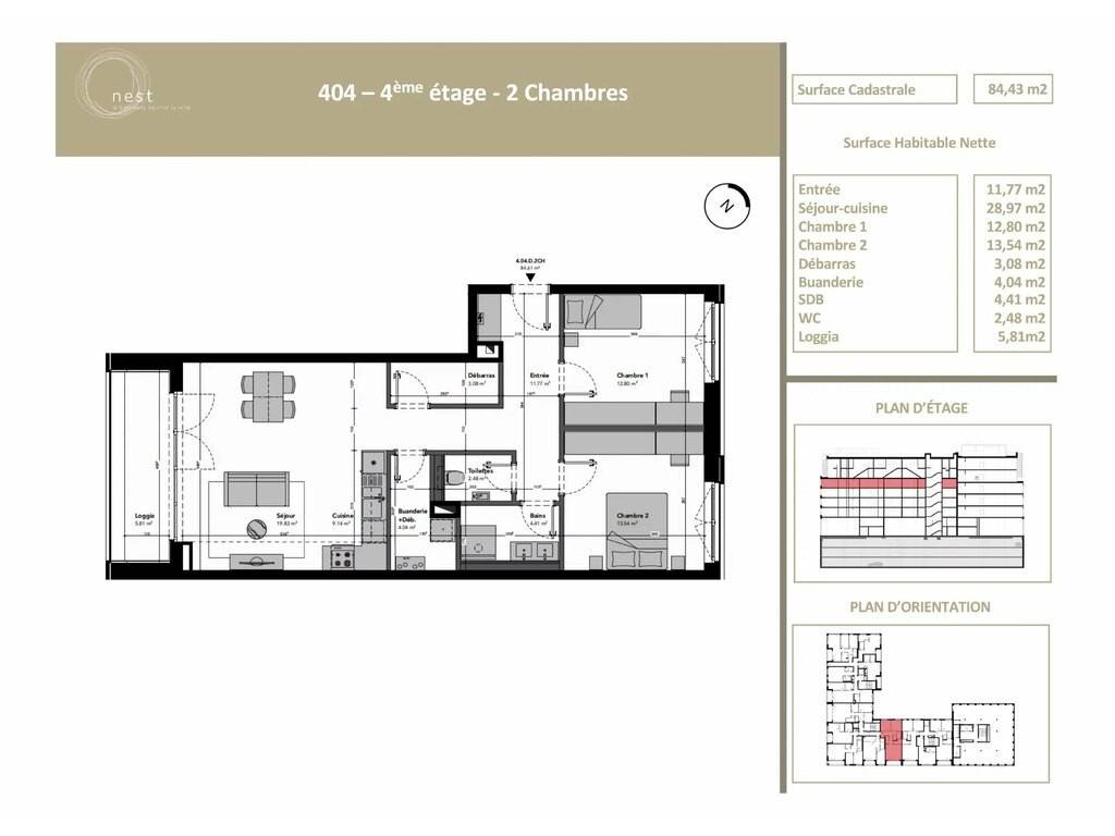 Die Wohnung Lot 4.04.D.2CH befindet sich im 4. Stock und verfügt über eine Katasterfläche von ±84,43 m², eine Loggia von ±5,81 m² und ist wie folgt aufgeteilt: