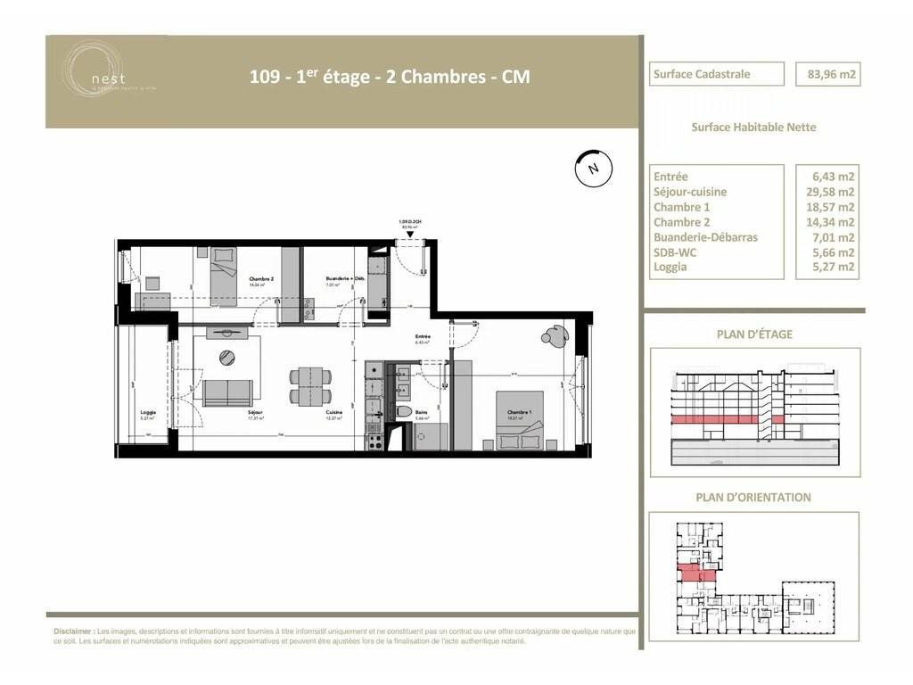 Die Wohnung Lot 1.09.D.2CH befindet sich im 1. Stock und hat eine Katasterfläche von ±83,96 m², eine Loggia von ±5,27 m² und ist wie folgt aufgeteilt: