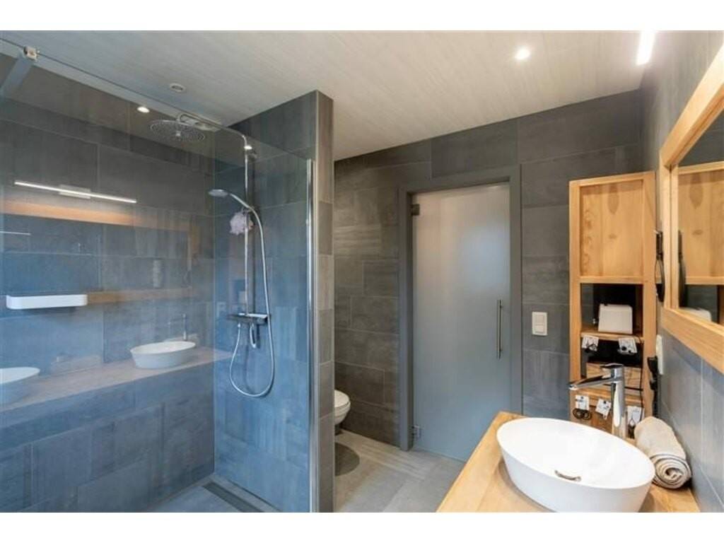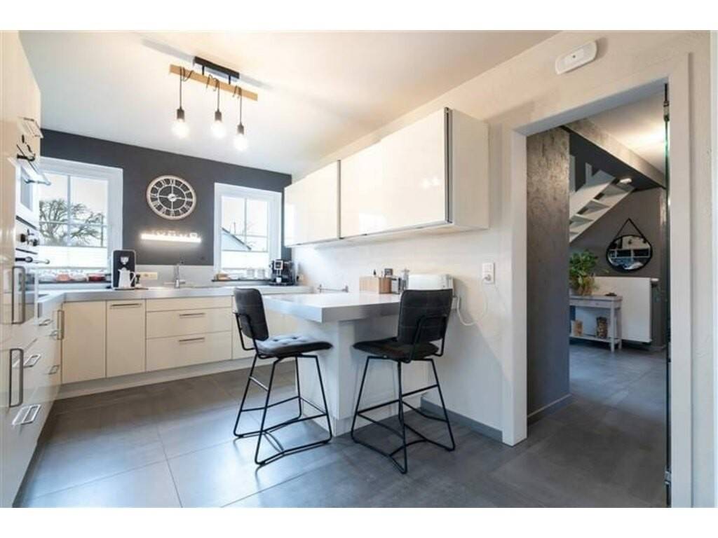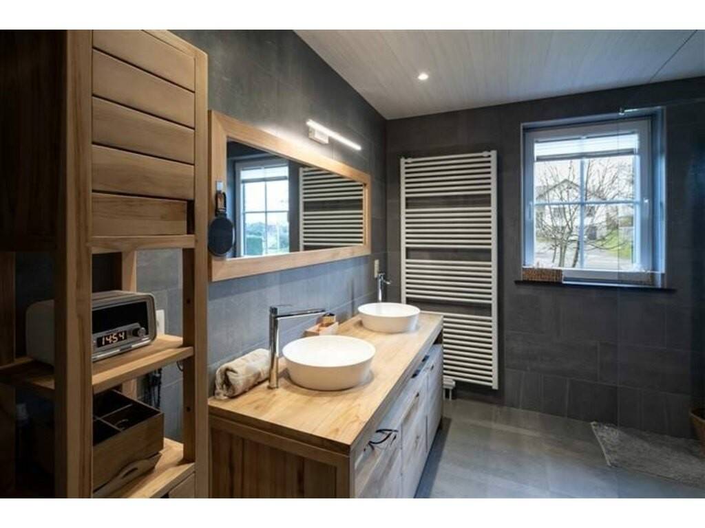 Le rez-de-chaussée, totalement fonctionnel pour une vie de plain-pied, offre un confort optimal : un séjour spacieux équipé d’un poêle à bois, une grande chambre, une salle de douche contemporaine, ainsi qu’un garage pratique et une buanderie. Les espaces sont fluides, logiques et intelligemment organisés.