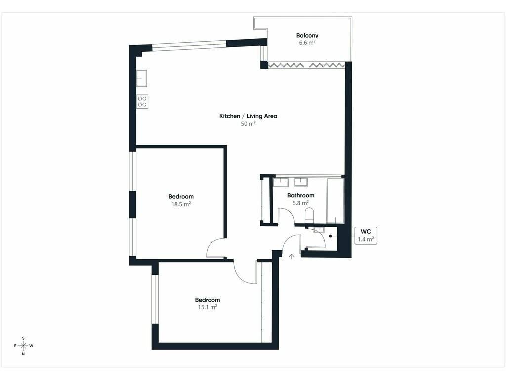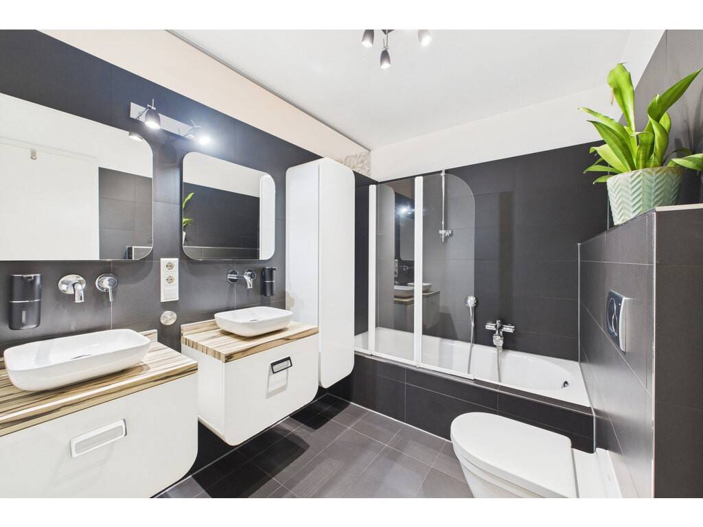 Layout: entrance hall, fully equipped open kitchen, living/dining area (50 sqm) - with direct access to the loggia (6.6 sqm) - 2 bedrooms ( 18.5 sqm + 15.1 sqm) - bathroom with double washbasin, bathtub and toilet ( 5.8 sqm) - separate toilet ( 1.4 sqm).