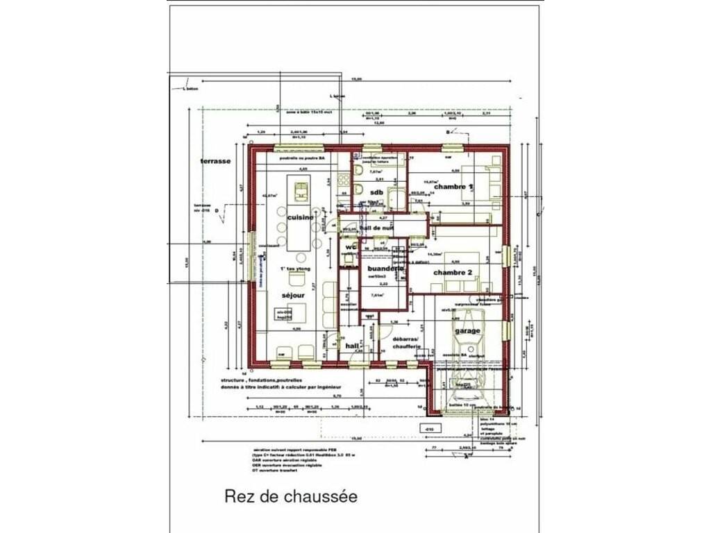 Rez-de-chaussée : hall d’entrée, spacieux living de 43 m² avec cuisine ouverte, 2 chambres à coucher (possibilité de 4 avec l'étage), salle de bains avec baignoire et douche, WC indépendant suspendu, buanderie (3,5 x 2,2 m), garage 1 voiture avec espace débarras (porte sectionnelle motorisée).