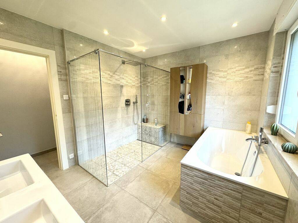 Hall d'entrée (+-13m2) avec placards encastrés, cuisine équipée (+-12m2), living-salle à manger (+-34,50m2) avec accès terrasse et jardin, salle de bains (+-10,80m2) avec douche italienne et baignoire, WC séparé, 1 chambre à coucher (+-11m2), coin bureau (+-5m) et accès à l'étage.