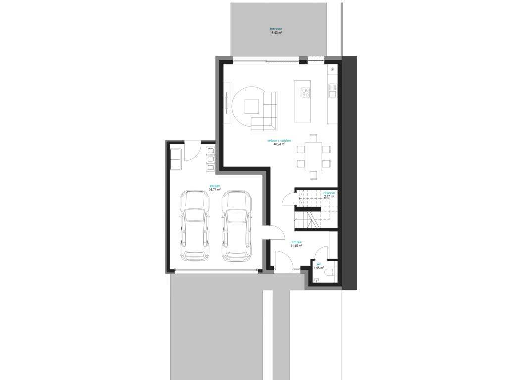 Im Erdgeschoss : -Eingangsbereich - Großer Wohnbereich mit offener Küche und Zugang zur Terrasse und zum Garten - Separates WC - Abstellraum - Garage für 2 Autos und 2 Außenstellplätze