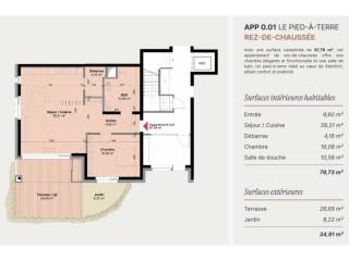 - Eine Eingangshalle - Ein 40m2 großes Wohn- und Esszimmer. - Direkter Zugang zur 26m2 großen Terrasse und zum 8m2 großen Privatgarten. - Eine offene Küche - Ein Schlafzimmer von 16m2 mit Zugang zum Garten - Ein Duschraum - Ein Abstellraum