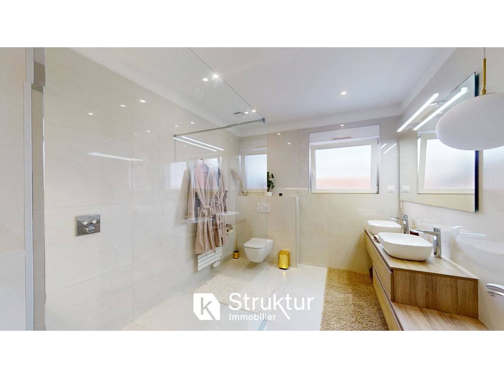 Une salle de bain contemporaine avec douche à l’italienne, double vasque et WC suspendu