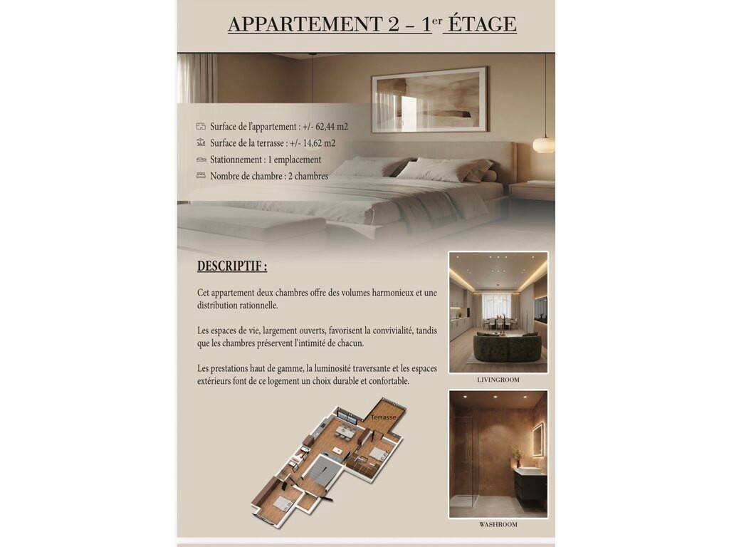 ± 62,44 m² | Terrasse ± 14,62 m² | 1 parking