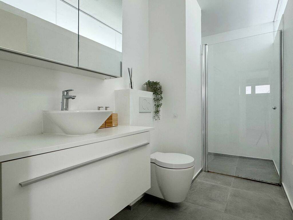 A ground floor including beautiful open living spaces (living room; dining room; kitchen: office); a guest bedroom with shower room; a laundry room; a separate toilet and a garage for 1 car. The large terrace of 40m² is accessible from the living room, the office and the bedroom.