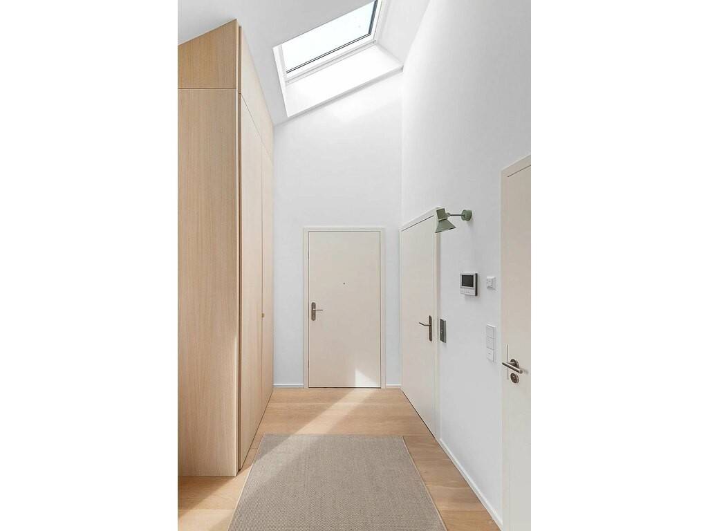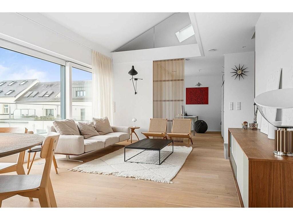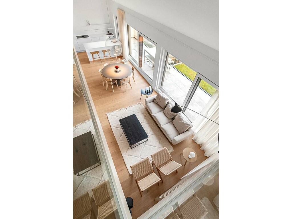 The living area (approximately 46m²) opens onto a large, particularly bright living room, enhanced by solid oak flooring, high ceilings and custom-made furniture, which give the space a warm and refined atmosphere.