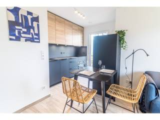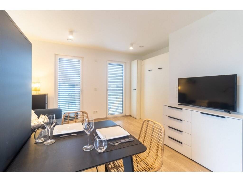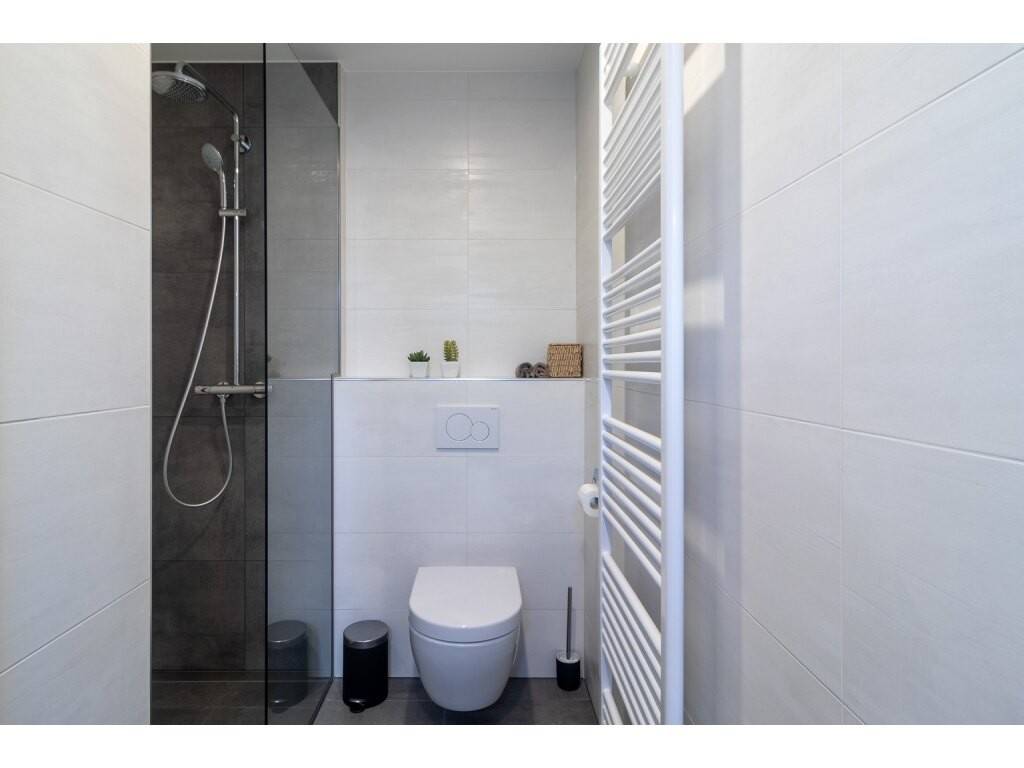 Distribution : hall d'entrée - cuisine entièrement équipée (appareils électroménagers de marque « Siemens », grille-pains, cafetière Nespresso, micro-ondes, ustensiles de cuisine) ouverte sur le living/salle à manger (lit escamotable 140cm, canapé, smart TV 40', aspirateur) - salle de bain avec douche à l'italienne et WC