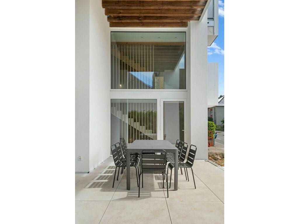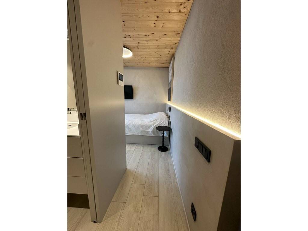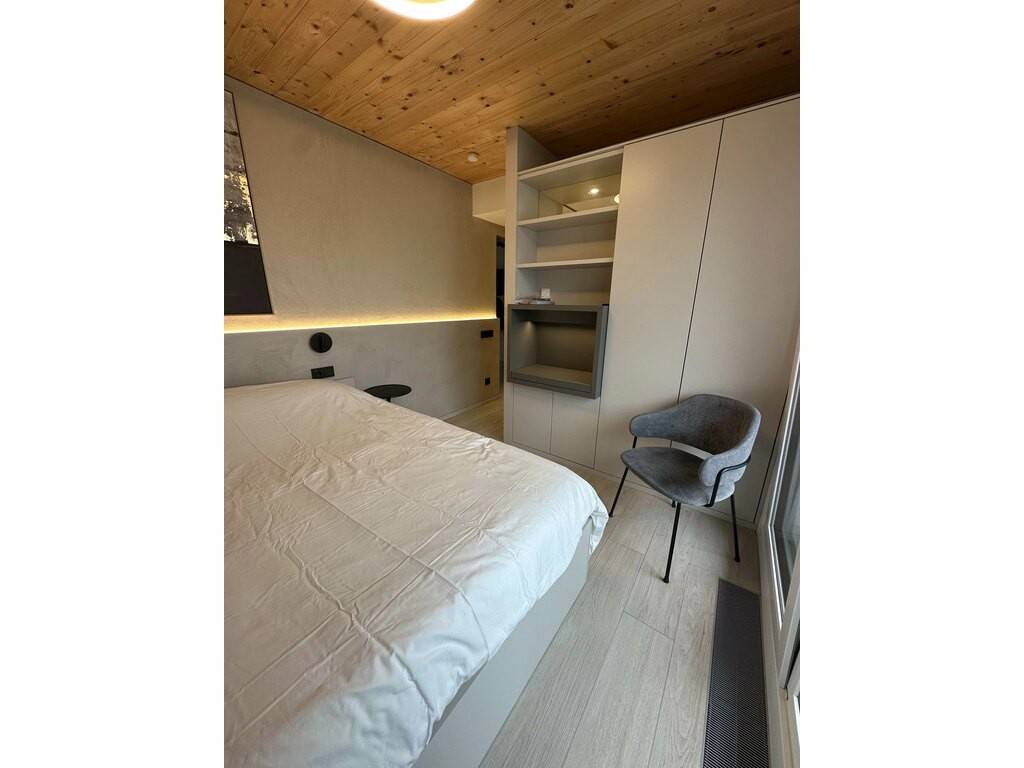 The room combines modernity, elegance, and sophistication with polished concrete and custom carpentry. It features: