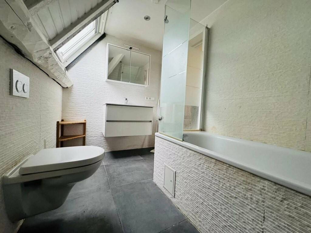 A spacious living room of ± 32m² comprising a semi-open fitted kitchen opening onto a living room, a bathroom of ± 5 m² (bath, washbasin, toilet) and a bedroom with cupboards of ± 7m².