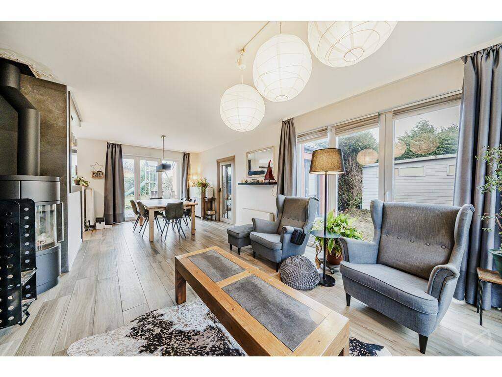 Outside: wooded garden, wooden terrace, garden shed and separate garage.